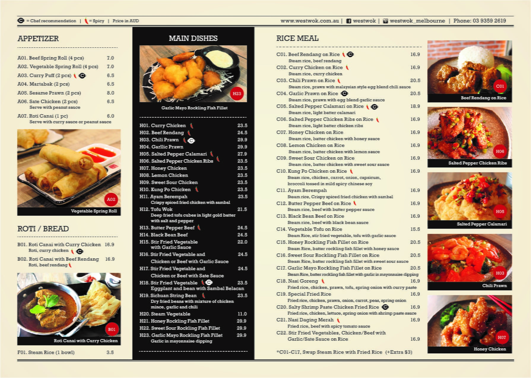 Click here for Dine In PDF MENU Click here for Take Away PDF MENU WestWokMalaysian Cuisine Shop 11, 1434 Sydney RdCampbellfield VIC – 3061Phone: 03 9359 2619Trading HoursMonday – Sunday11:15 am – 8.30 pmFollow us on Facebook Instagram